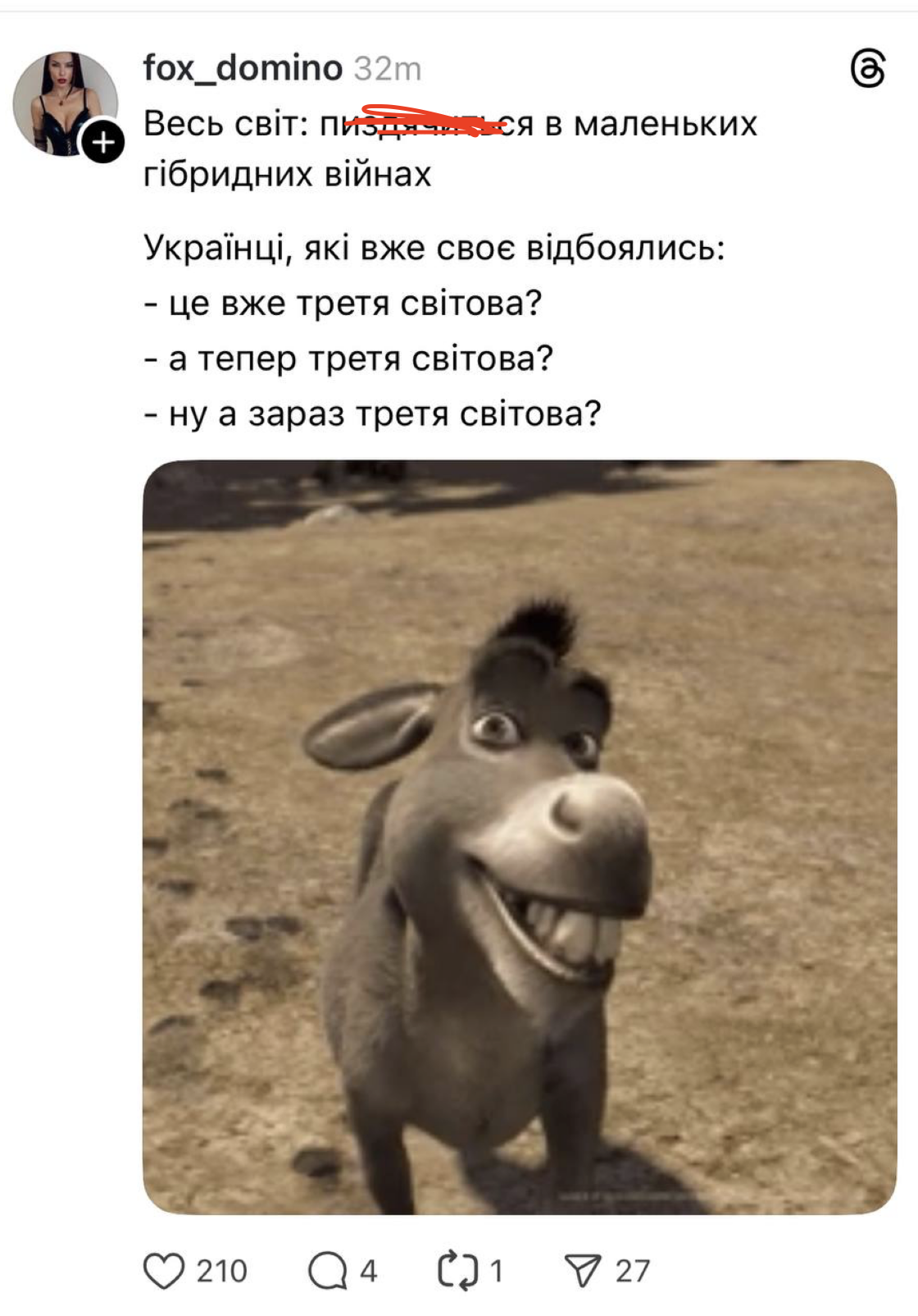 Саме на тлі цього українці жартують, що прийшла не весна, а Третя світова війна. Сюди ж додали й віслюка зі "Шрека" з його нетерплячими питаннями.