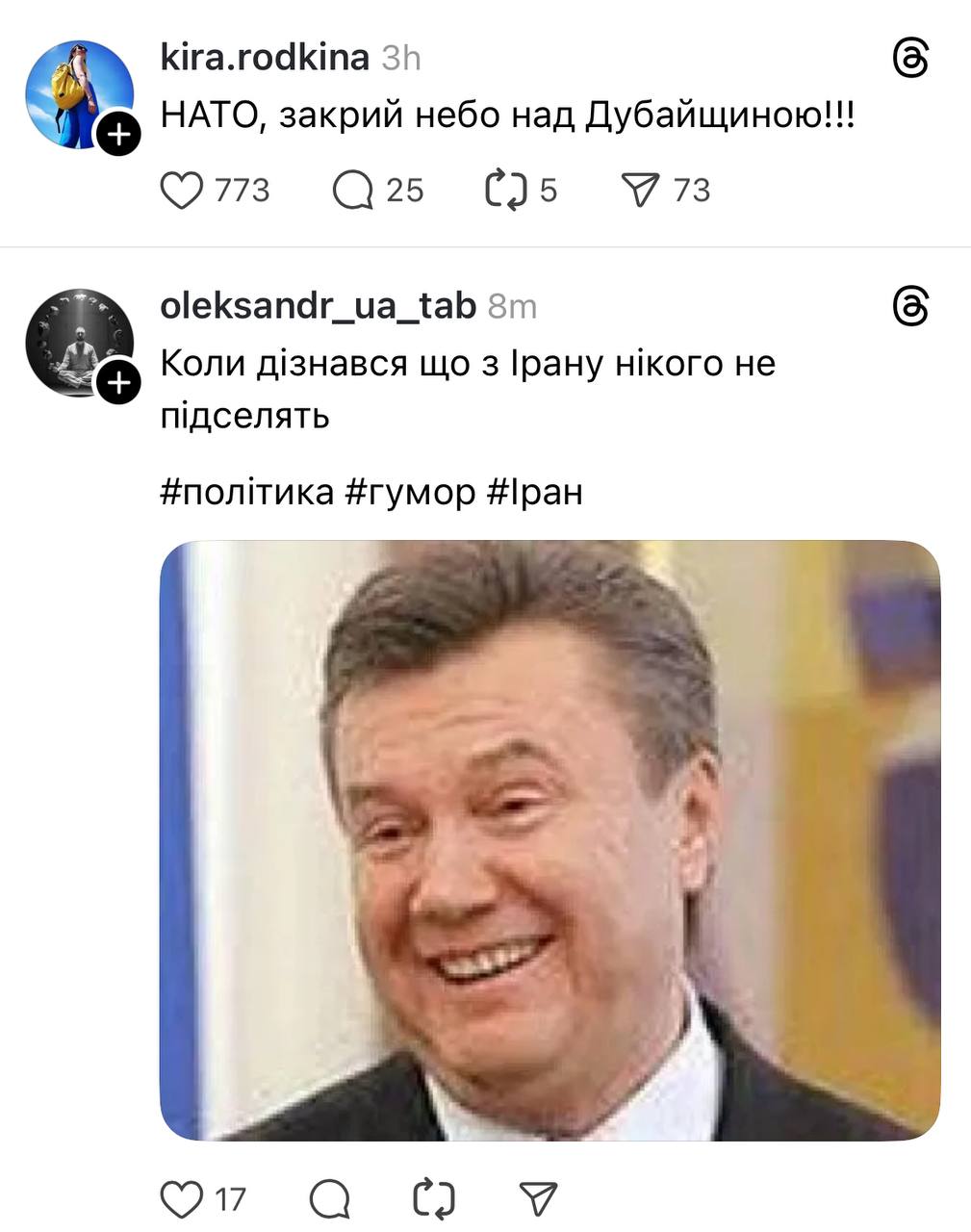 Окремою темою для мемів стала інформація, що верховного лідера Ірану Аятолла Хаменеї нібито було вбито. Як відомо, Іран один з партнерів та союзників Росії, саме тому люди згадали президента-втікача Віктора Януковича.