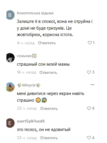 "Залиште її в спокої, вона не отруйна і у домі не буде гризунів. Це жовтобрюх, корисна істота".