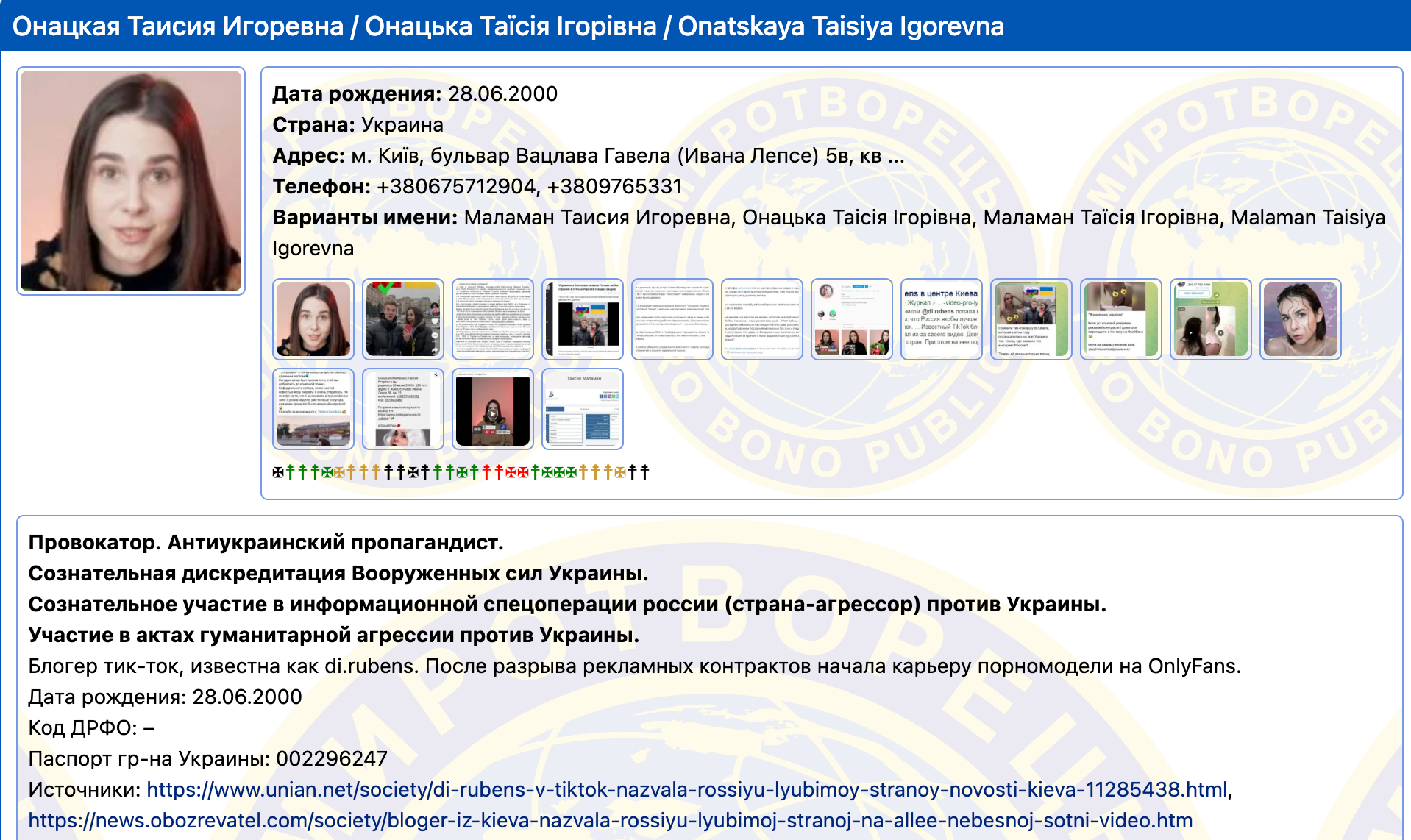 За свідому участь в інформаційній спецоперації Росії проти України та дискредитацію нашої армії Таїсія опинилася у базі "Миротворець".