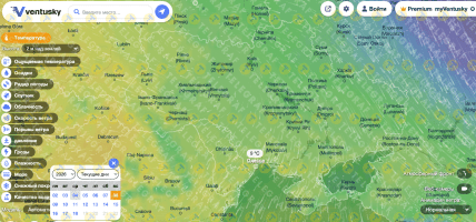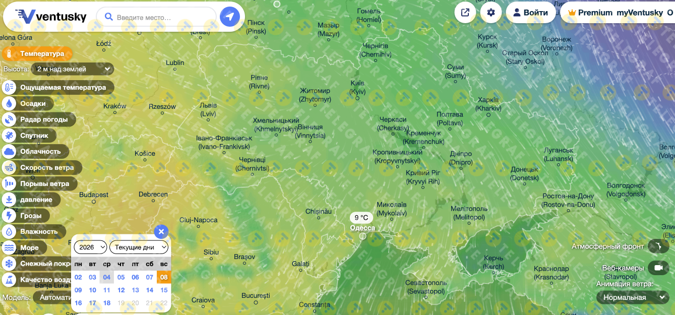Згідно з картами сервісу Ventusky, Одеський регіон перебуватиме під впливом помірних повітряних мас. На метеорологічній мапі зафіксовано показник +9°C для прибережної зони.
