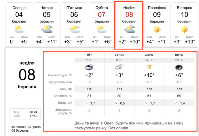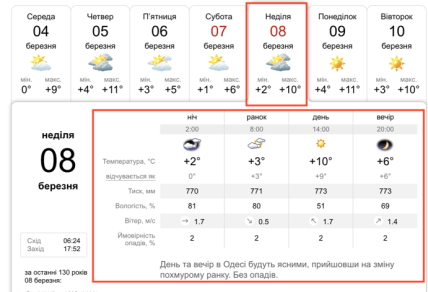 Погода в Одесі у неділю, 8 березня, обіцяє бути приємною та по-справжньому весняною. Попри ранкову прохолоду, місто опиниться у зоні комфортних температур, що дозволить одеситам та гостям міста насолодитися святковим днем без парасольок.