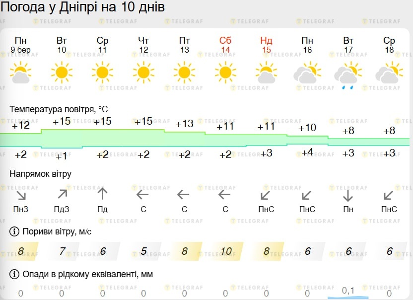 У найближчі десять днів у Дніпрі очікується переважно спокійна та дуже тепла для початку березня погода. Однак наприкінці періоду синоптична ситуація зміниться — температура дещо знизиться, а в середині наступного тижня можливі опади.