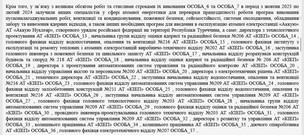 Через великий обсяг і стислі строки виконання робіт у період з жовтня 2023-го по лютий 2024 року організатори оборудки залучили десятки інших спеціалістів КІЕП. У матеріалах ухвали наведено докладний перелік — від директорів напрямів і начальників відділів до головних фахівців з ядерної, радіаційної, пожежної безпеки, вентиляції, сейсмостійкості, електротехнічних та автоматизованих систем. Всі ці люди, бувши фахівцями українського підприємства, по суті, працювали напряму на російський "Росатом".