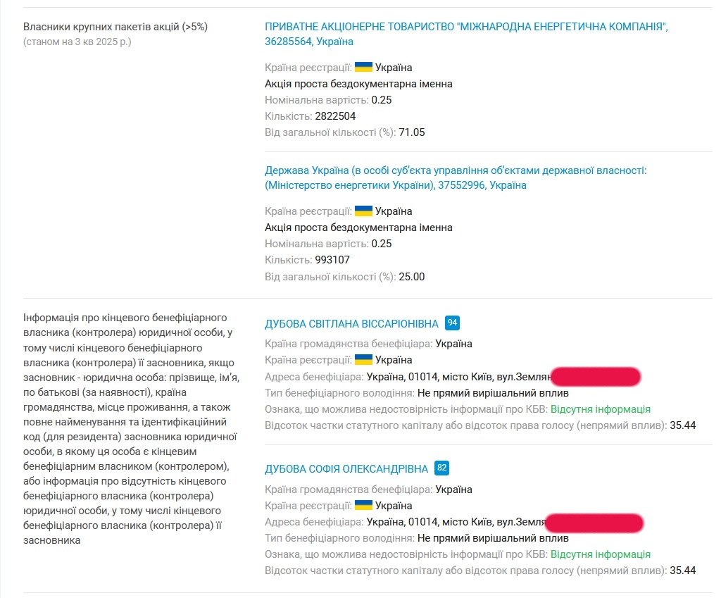 За даними YouControl, лише 71,05% відсотка компанії через ПрАТ "МЕК" належать Софії та Світлані Дубовим (відповідно, доньці та дружині Олександра Дубового). А ще 25% компанії перебуває у власності Держави Україна через Міністерство енергетики.