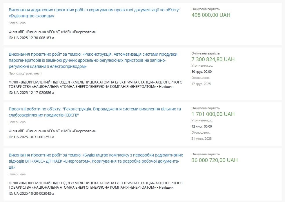 Частина з переліку тендерів "Енергоатому", виграних АТ "КІЕП". Останній – 30.12.2025. Джерело – Prozorro
