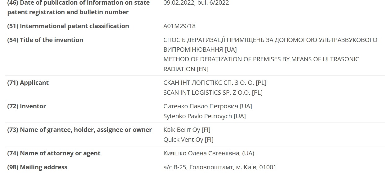 • 150404 (спосіб дератизації приміщень за допомогою ультразвукового випромінювання).