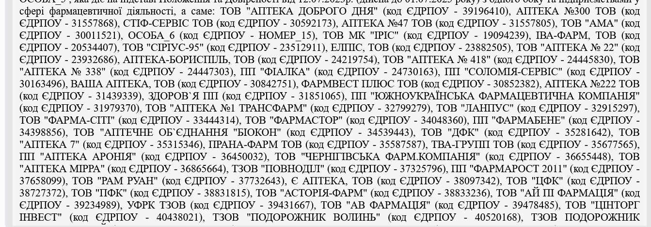Частина переліку аптек, ймовірно, задіяних у схемі з виводом коштів за допомогою фіктивних роялті, скриншот фрагменту судового рішення. Джерело — ЄДРСР