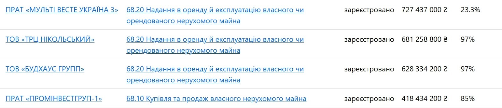 Доходи основних підприємств девелоперського бізнесу Шкрібляка за 2025 рік. Дані Opendatabot