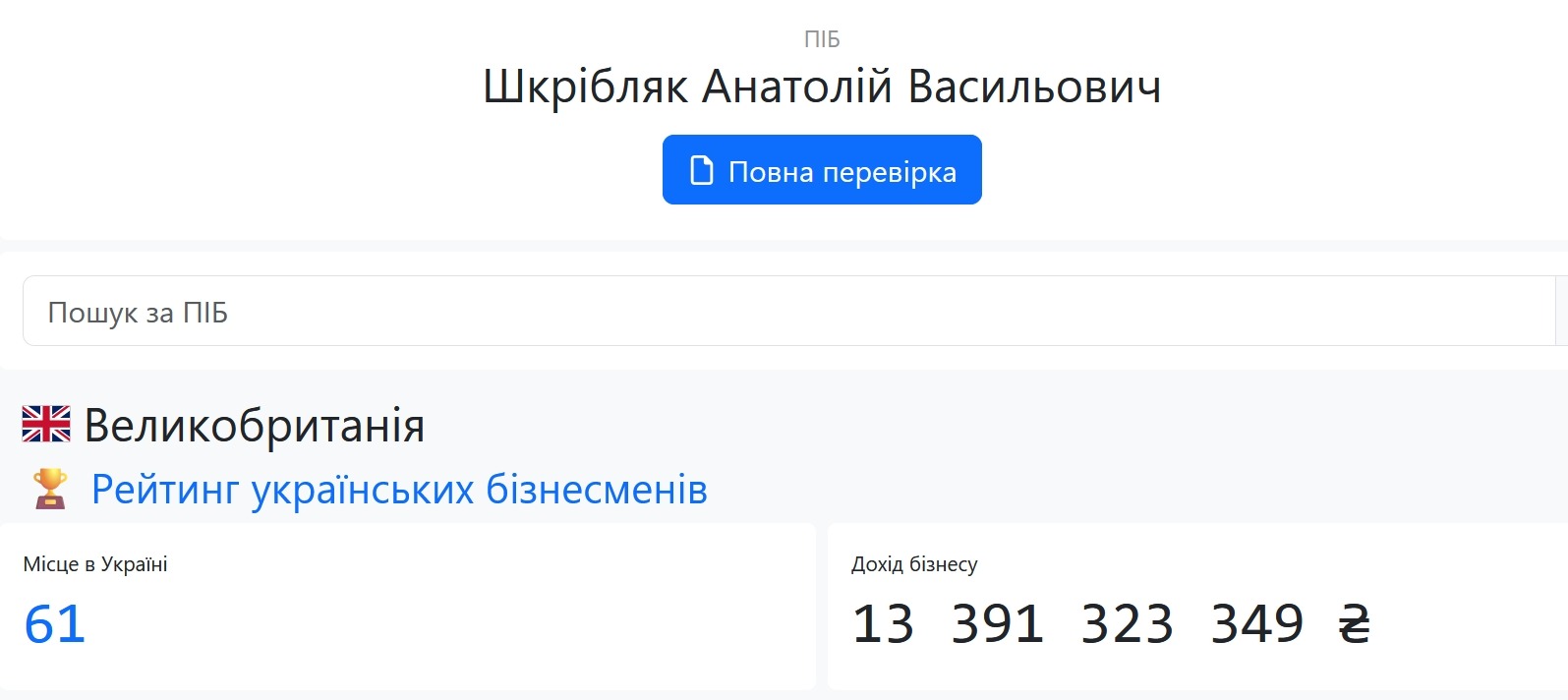 Наразі Шкрібляк посідає 61-шу сходинку серед "найдохідніших" бізнесменів України. Його сукупний дохід за 2025 рік зі всіх бізнесів, як свідчать дані opendatabot.ua, склав 13,4 мільярда гривень.
