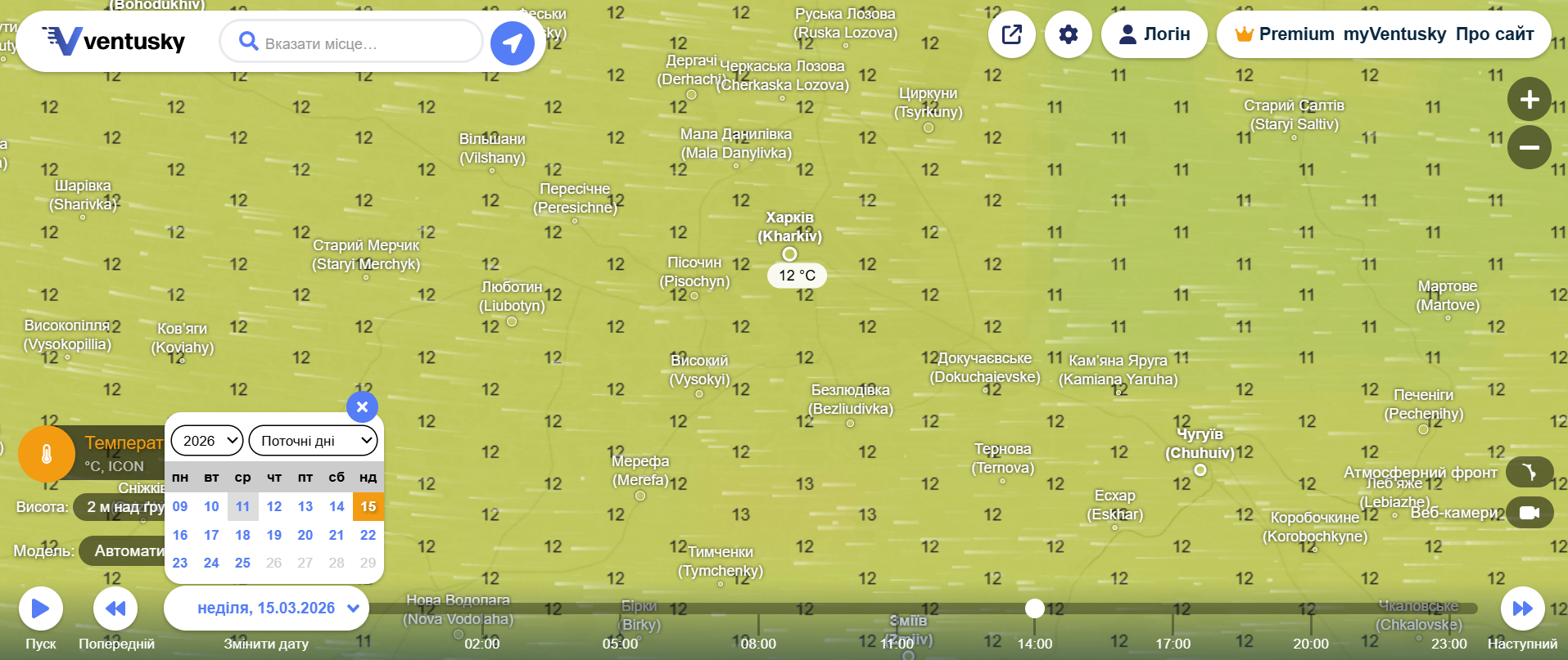 Погода у Харкові на 12 березня. Фото: ventusky