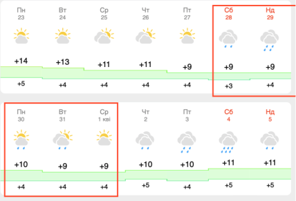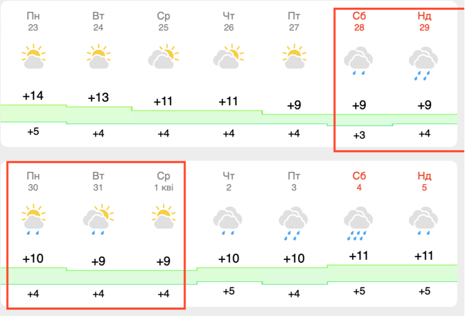 У середу, 1 квітня, погода також не порадує справжнім весняним сонцем, оскільки буде похмуро, а температура стабілізується на позначці +9 градусів. Протягом усього перехідного періоду з кінця березня на початок квітня нічна температура триматиметься на рівні +4°C, що в поєднанні з високою вологістю створюватиме відчуття сильної вогкості та холоду.