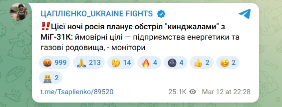 В ніч на 13 березня Росія планує обстріл України ракетами "Кинджал" з винищувачів МіГ-31К. Серед ймовірних цілей — підприємства енергетики та газові родовища.