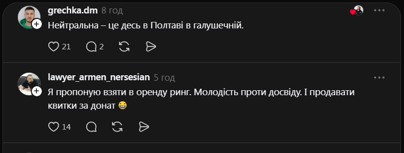 Користувачі іронізують, що поки опоненти відстоять чергу — встигнуть помиритися. Також жартома пропонують взяти в оренду ринг, влаштувати бій — молодість проти досвіду та продавати квитки за донат. Один з коментаторів зазначає, що Філатову та Лачену варто було б "зустрітися у психіатра".