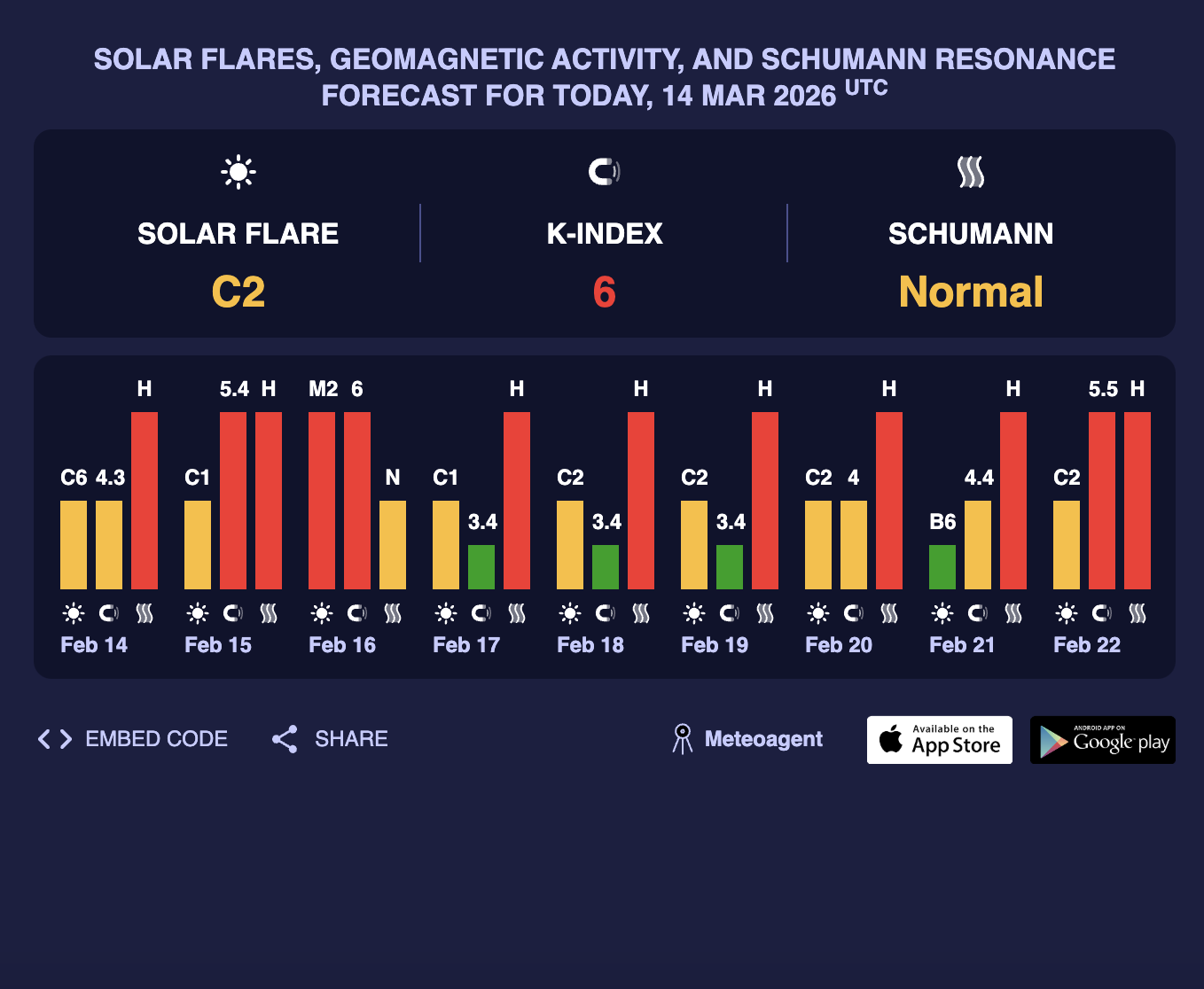 Як повідомляє Центр прогнозування космічної погоди (SWPC) NOAA, з 13 по 16 березня на планету обрушаться магнітні бурі. Їхній пік припаде на суботу, коли буде сонячна активність з К-індексом 4,7 (жовтий рівень). Це відповідає середнім магнітним бурям.