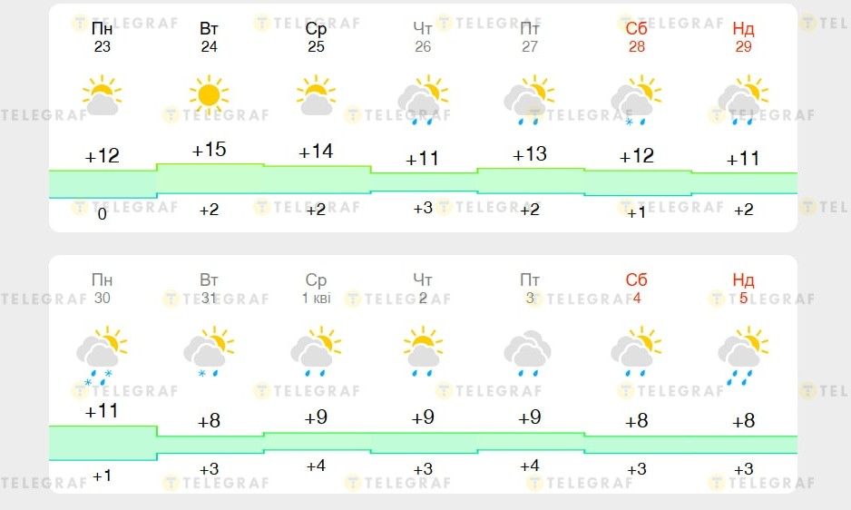 Найбільш нестійкою погода буде з 28 березня, суботи. Опади посиляться, а через зниження температури можливий мокрий сніг. Денна температура коливатиметься близько +8…12 °C та нічна — +1…3 °C. Найхолодніше буде 31 березня.
