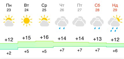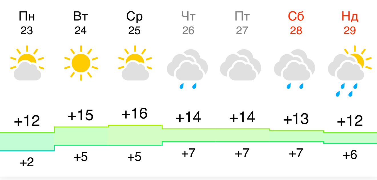 Останній тиждень березня почнеться досить оптимістично. У понеділок та вівторок (23-24 березня) харків'ян ще радуватиме сонце, а повітря прогріється до +12…+15°C. Середа стане піковим днем тепла із показником +16°C.