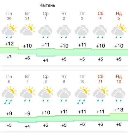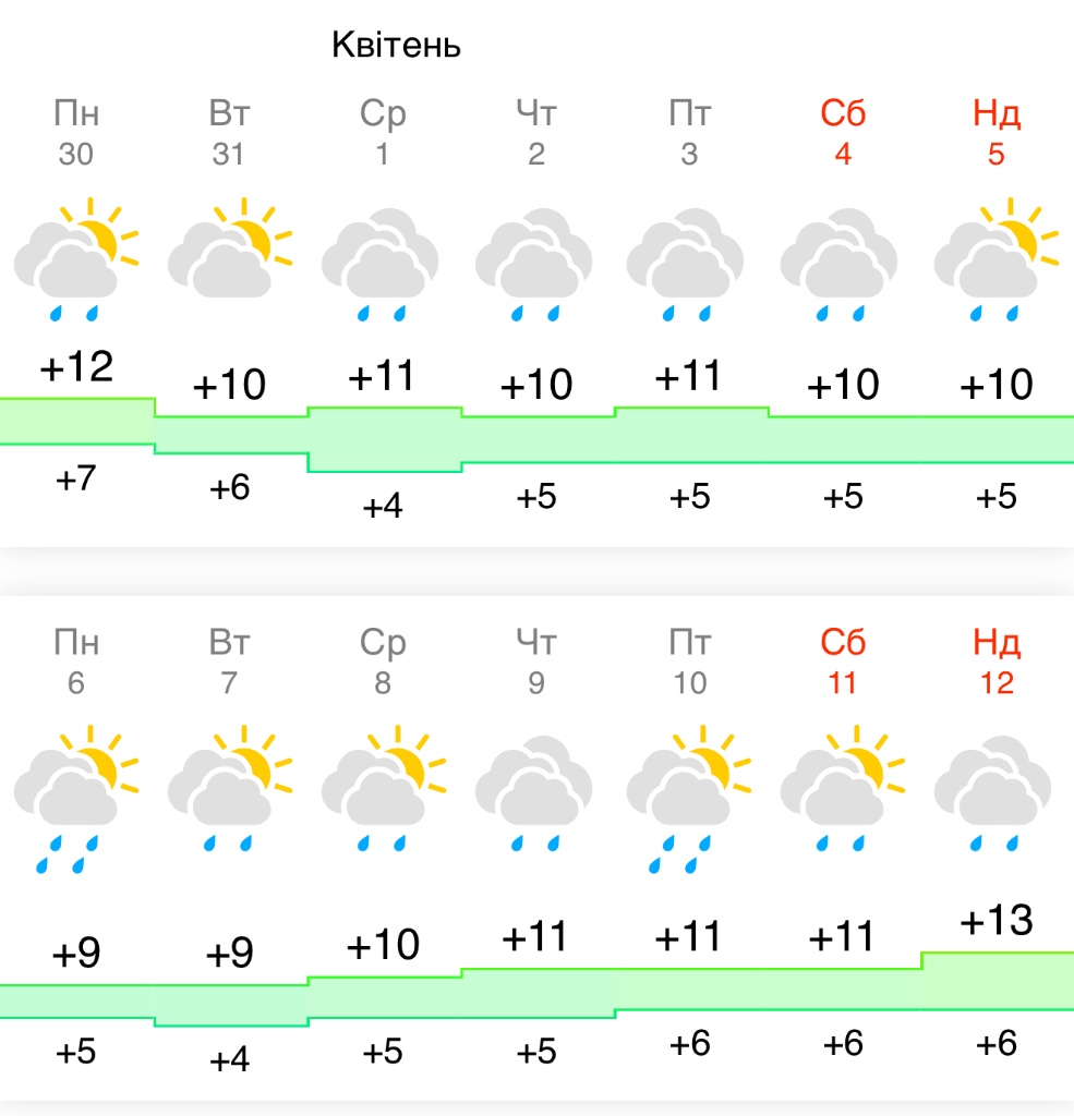 З 1 по 5 квітня очікується стабільно похмура погода з денною температурою близько +10…+11°C. Найбільш прохолодним періодом стануть 6 та 7 квітня, коли вдень буде не вище +9°C, а дощі посиляться.