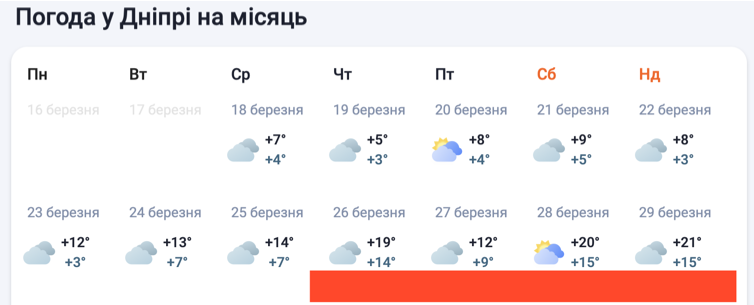 Погода у Дніпрі наприкінці березня та у першій половині квітня буде мінливою. Якщо фінал першого весняного місяця потішить майже травневим теплом, то квітень змусить знову згадати про куртки.