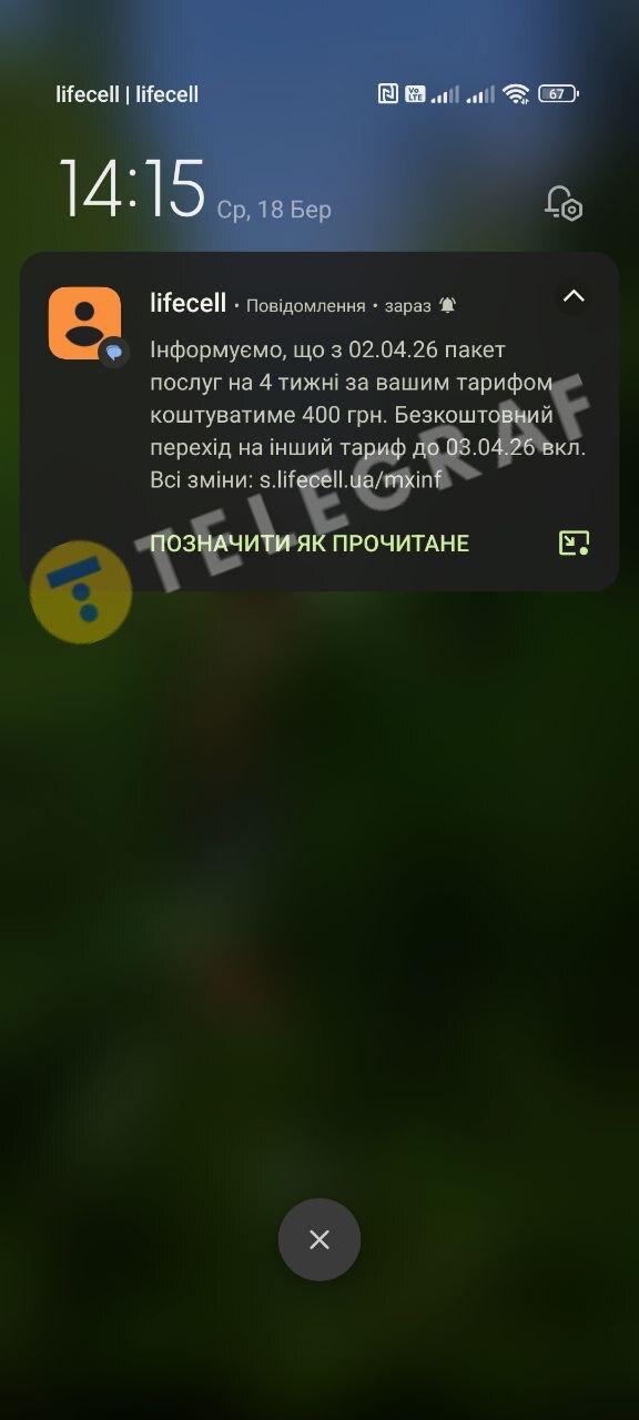 Абоненти мобільного оператора України lifecell почали отримувати SMS з повідомленнями про збільшення вартості тарифів 18 березня 2026 року. Нові ціни почнуть діяти вже з 2 квітня.
