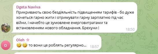 "Прикривають свою бездіяльність підвищенням тарифів — бо дуже хочеться гарно жити і отримувати гарну зарплатню під час війни, і начебто це зумовлене енерговитратами та встановленням нового обладнання. Брехуни"- пишуть користувачі.