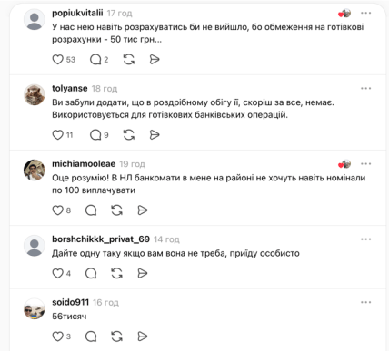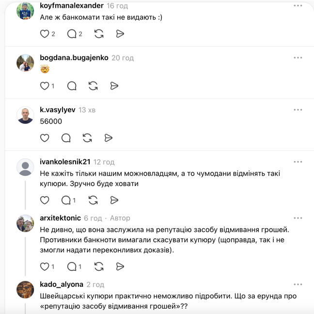 Новина про банкноту викликала жваве обговорення серед українців. Користувачі жартують, що про таку новинку краще не знати політикам, адже "чумодани" для готівки тепер відійдуть у минуле — ховати такі гроші значно легше. Дехто слушно зауважив, що в Україні розрахуватися такою купюрою було б неможливо, оскільки діє обмеження на готівкові розрахунки до 50 тисяч гривень.