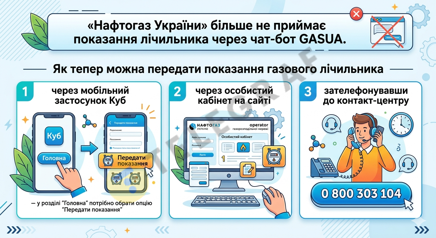 "Нафтогаз України" більше не приймає показання лічильника через чат-бот GASUA. Для передачі даних про спожитий газ запустили мобільний застосунок, є й інші способи.