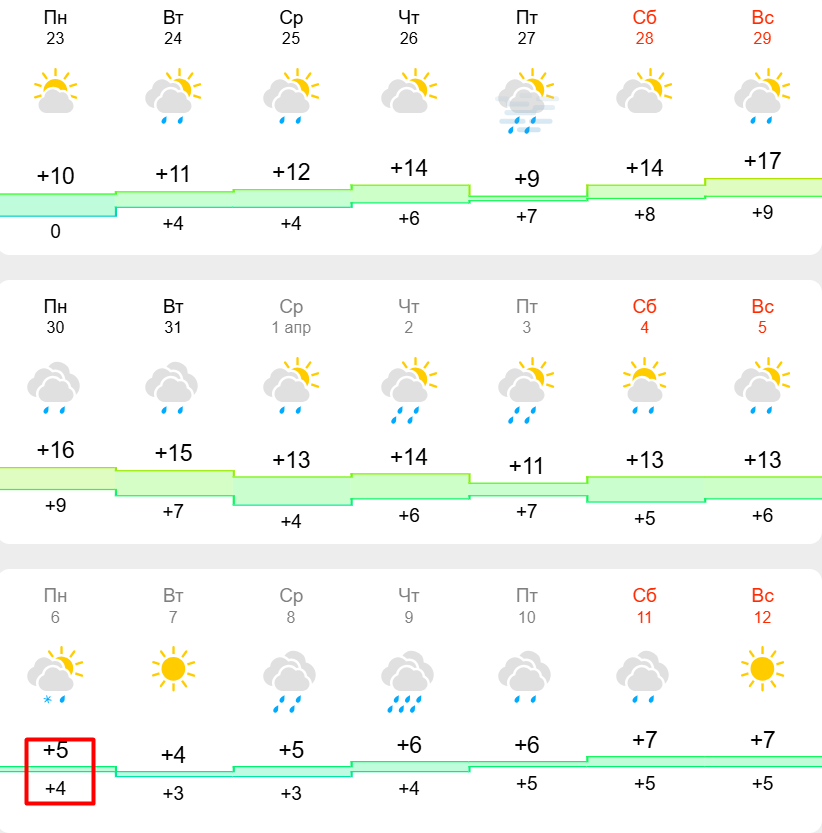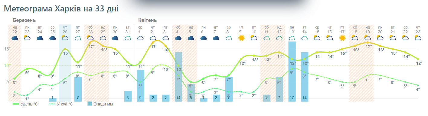 У суботу, 28 березня, очікується наступна хвиля потепління, коли весна боротиметься за свої права. У період трохи більше ніж тиждень повітря прогріватиметься до +11… +17 градусів. Варто зазначити, що в цей час також прогнозують опади.