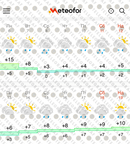 Найбільш неприємним сюрпризом стане повернення зимових опадів. Протягом усього тижня перед Великоднем очікується мокрий сніг з дощем. Температура повітря вдень впаде до +3…+4°C. У середині тижня температура повітря вночі опуститься до 0°C, а в інші дні коливатиметься в межах +1…+2°C.
