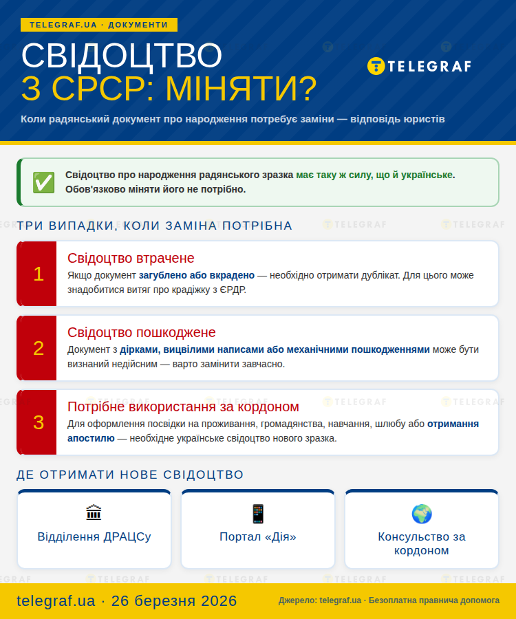 Безоплатна правнича допомога стверджує, що свідоцтво про народження радянського зразка має ту ж саму силу, що й українське. Однак, є застереження — може виникнути потреба змінити документ у трьох випадках: