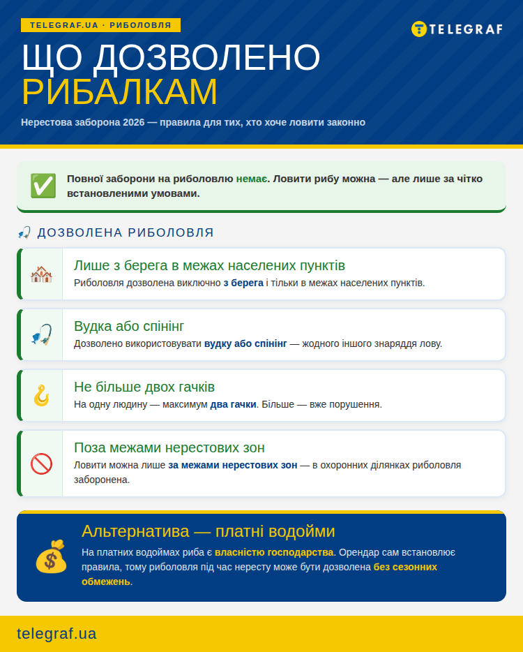 Ще один варіант — платні водойми. Там риба є власністю господарств, тому орендар сам встановлює правила, і риболовля під час нересту може бути дозволена без загальних сезонних обмежень.