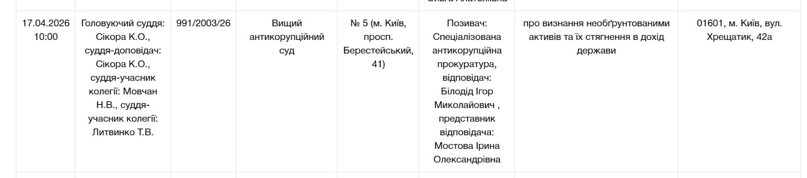 18 березня Вищий антикорупційний суд відкрив провадження за позовом Спеціалізованої антикорупційної прокуратури про визнання необґрунтованими активів Ігоря Білодіда та стягнення їх у дохід держави.