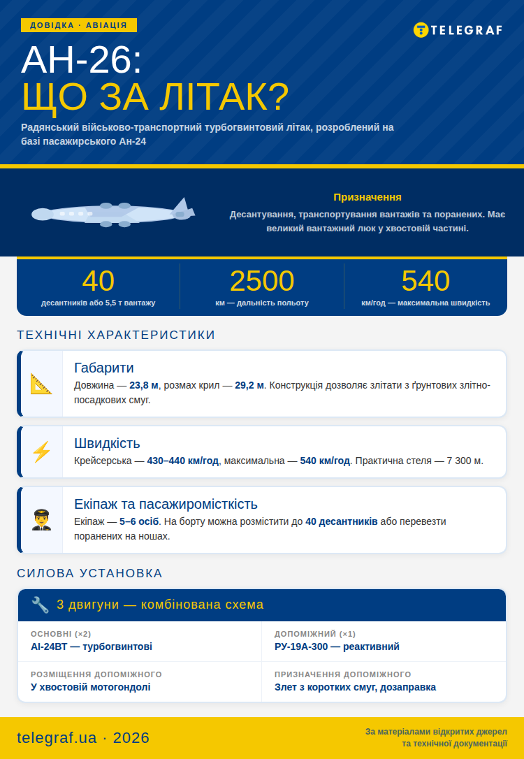 Ан-26 — це радянський турбогвинтовий легкий військово-транспортний літак, створений на базі пасажирського Ан-24. Він має великий вантажний люк та третій допоміжний двигун. Літак здатний перевозити до 5,5 тонн вантажу або 40 десантників.