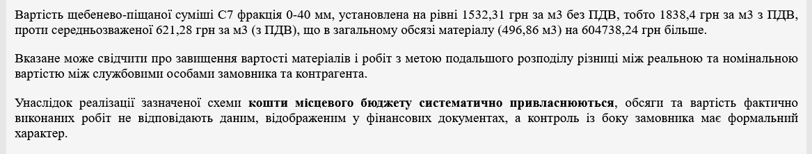 У документах суду детально наведені приклади потенційних переплат: зокрема, на експлуатації дорожньої техніки, асфальтобетонних сумішах та щебенево-піщаних матеріалах.