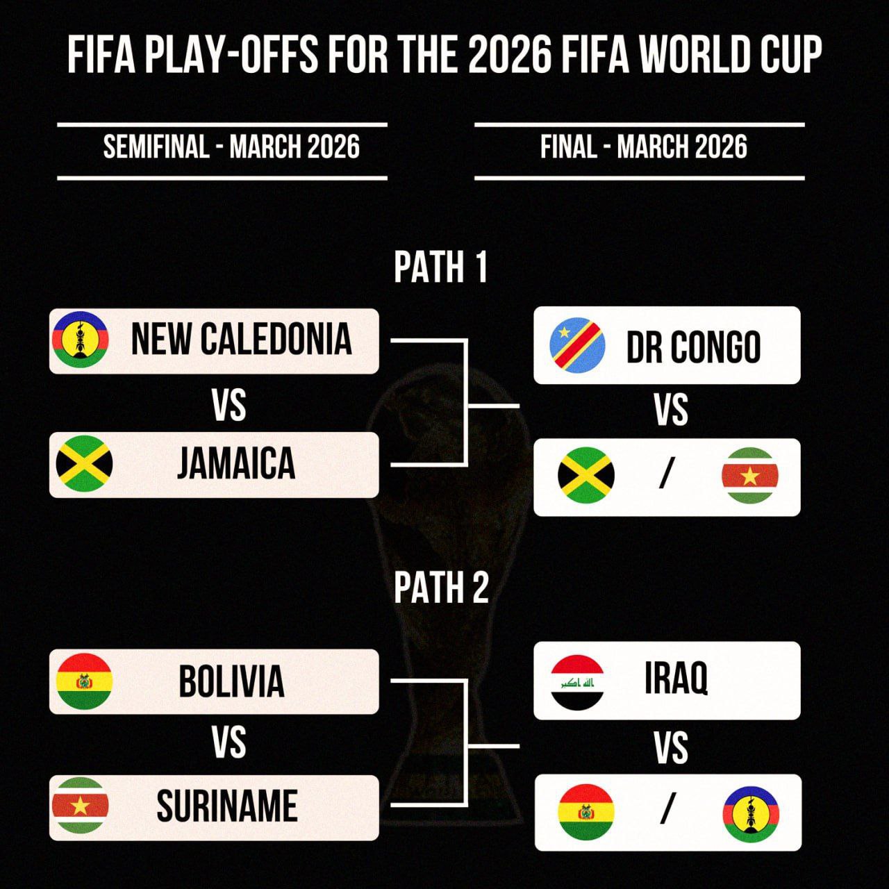 За правилами кваліфікаційного турніру представники першого кошика у півфіналі плейоф зіграють із представниками четвертого кошика; представники другого кошика – з представниками третього кошика. У фіналі зіграють переможці півфіналів кожного із чотирьох шляхів.