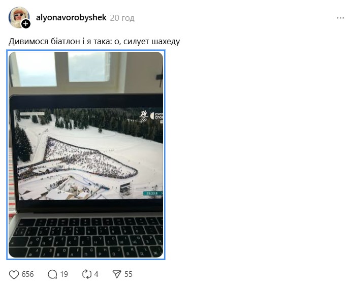 Одна з українських користувачок побачила під час гонки "Шахед" і поділилася своїми спостереженнями у threads. Альона Воробйова, як і багато українців, побачили в контурах трибун на Олімпіаді-2026 силует БПЛА "Шахед".