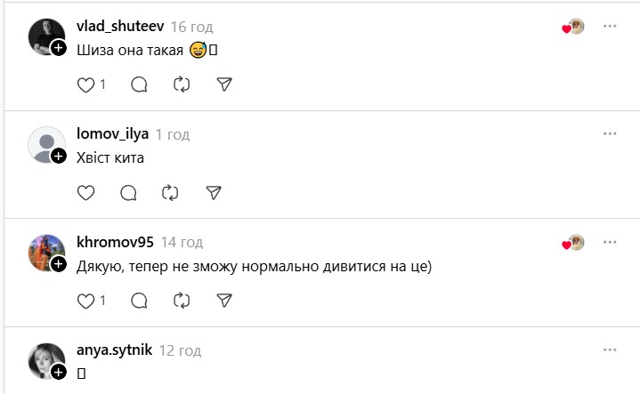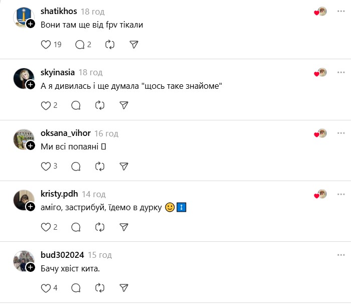 У мережі наголосили, що це пов’язано з війною — українці регулярно бачать "Шахеди" не лише на відео, а й наживо, а звук "Мопеда" став одним із символів російського терору. Додамо, що деякі побачили на скриншоті хвіст риби чи кита.