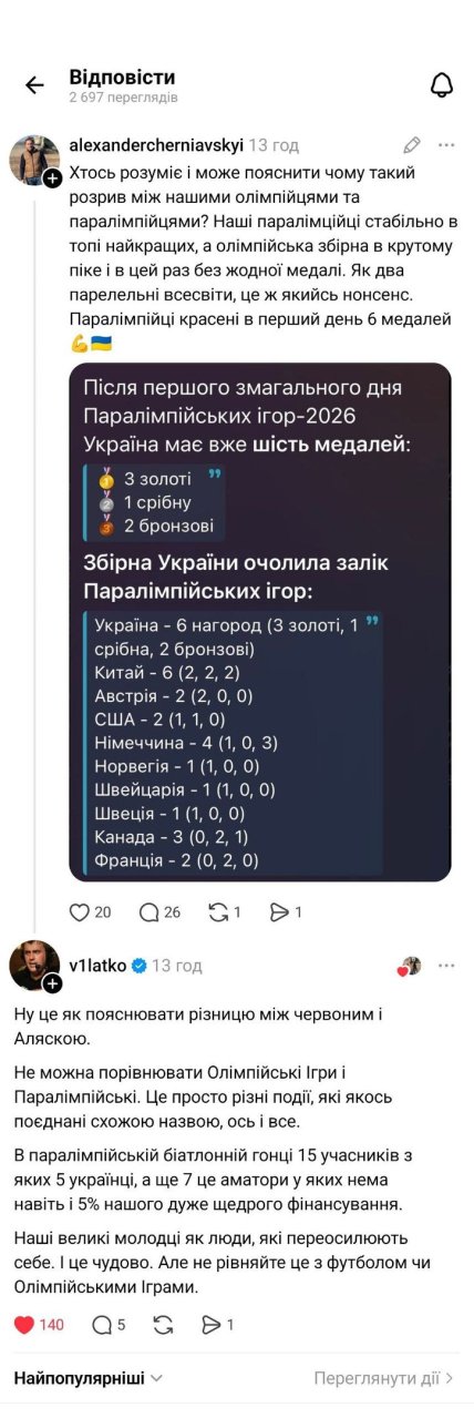 Наші — великі молодці як люди, які перемагають себе. І це чудово. Але не рівняйте це з футболом чи Олімпійськими Іграми.