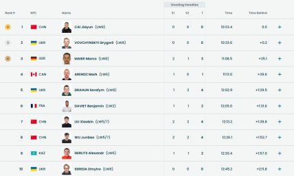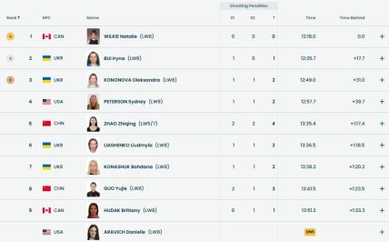 12:05 — 🥇Парабіатлон. Спринт переслідування, жінки (спортсменки з порушеннями зору) (кваліфікація) – Романа Лобашева посіла 11-те місце, Ілона Варковець – 9-те, Олександра Даниленка – 10-те, Оксана Шишкова – 7-ме.