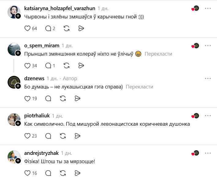 Після того як зелений та червоний кольори змішалися "коричнева хмара" накрила трибуни. Момент викликав хвилю жартів у мережі. Користувачі відзначили символізм у події — за офіційними кольорами лукашенківської Білорусі ховається "коричнева чума".