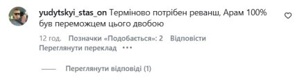 Українська публіка освистала суддівське рішення, а у мережі розгорілися суперечки через цю ситуацію. Багато хто вважає, що аргентинець симулював, адже на момент зупинки бою Арам перемагав. Суддівський рахунок був 82-88, 83-87 та 82-88 на користь українця.