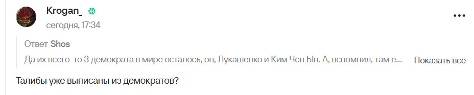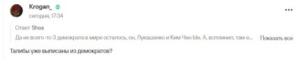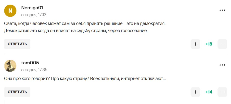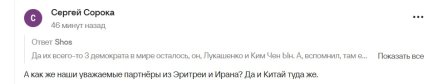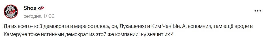 У мережі лише посміялися зі слів Журова. Користувачі жартують, що до компанії "справжніх демократів" також входять Олександр Лукашенко та Кім Чен Ин. Цікаво, що Світлана зробила заяву на тлі обмежень месенджерів та Інтернету у РФ.