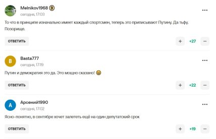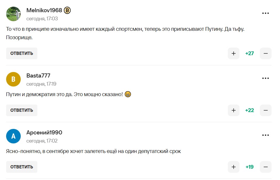 Володимир Володимирович подав серйозний приклад, хоч би як його змушували заборонити нашим спортсменам їхати на змагання без прапора та гімну, коли не пішов цим шляхом. Він одразу сказав, що поважає спортсменів і дає їм можливість самим ухвалити рішення – їхати на змагання у нейтральному статусі чи ні.