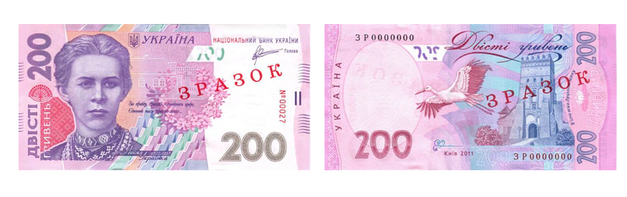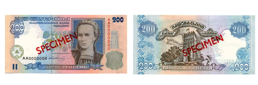 Банкнота номіналом 200 гривень є єдиною на якій зображена жінка. На ній розмішений портрет поетеси Лесі України, цитата "За правду, браття, єднаймось щиро, Єдиний маєм правий шлях…", а зі зворотного боку — в'їзна вежа Луцького замку і лелеки.