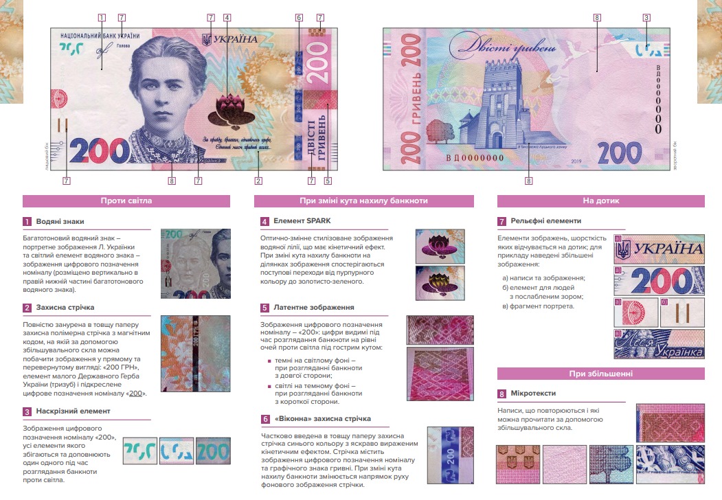 Купюра у 200 грн також має кілька типів захисту, серед яких оптично-змінний елемент SPARK — водяна лілія. Залежно від того, під яким кутом дивитись вона може бути пурпуровою чи навіть золотисто-зеленою.