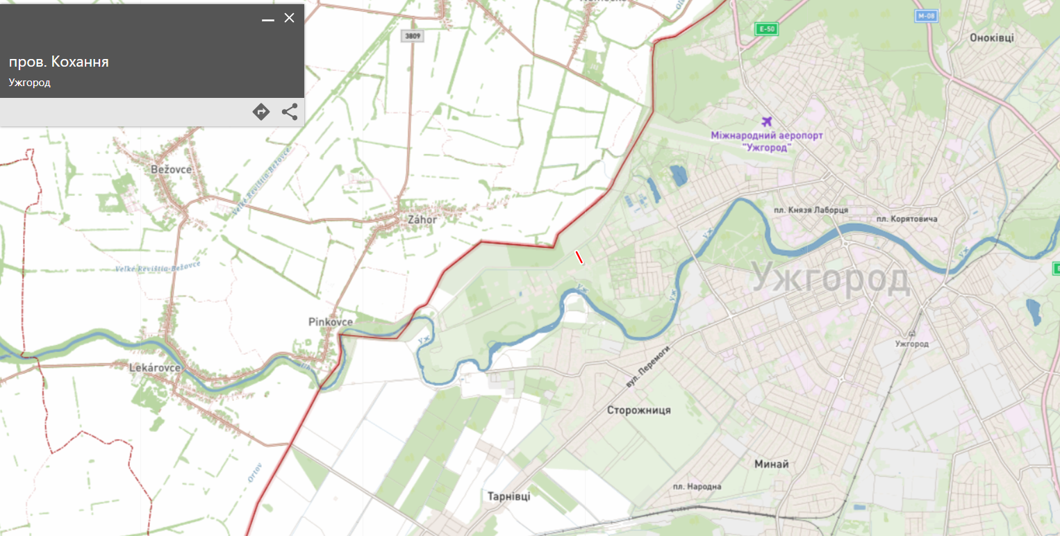 Червона риска - провулок Кохання на мапі Ужгорода