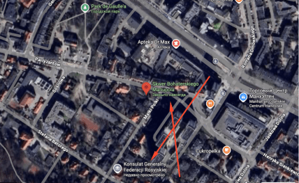 Сквер розташований у районі Вжещ (Wrzeszcz), на перехресті вулиць Марії Конопницької та Грюнвальдської. Що цікаво, поруч знаходиться консульство країни-агресорки. Російські дипломати змушені бачити назву міста, яке вони намагалися стерти з лиця землі.