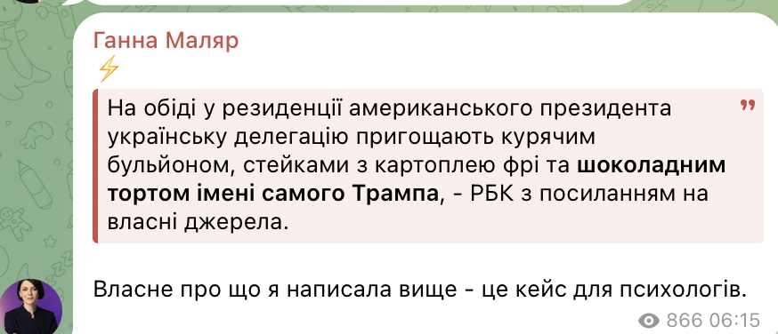 Щодо їжі та промови Трампа, де він не одноразово наголошував на своїй силі, висловилась й відома журналістка Ганна Маляр: "Тут навіть коментувати нема чого. Це цікавий кейс для психологів. Десь же хтось його так сильно знецінив колись, що він кладе на плаху цій образі долю народів — і свого, і нашого".
