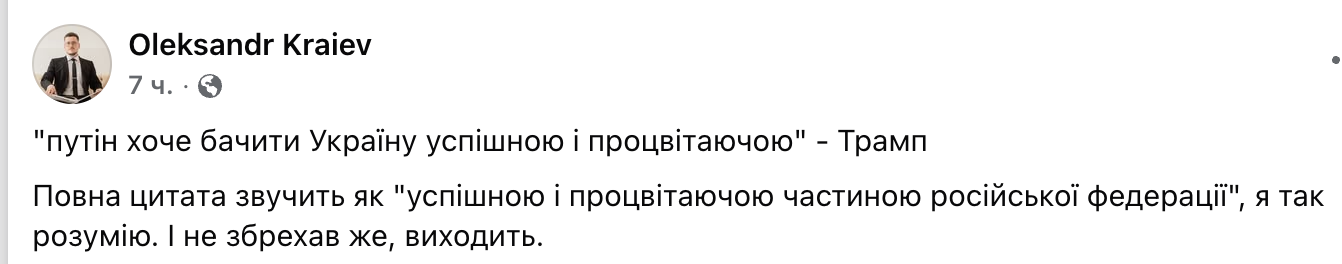 Директор програми "Північна Америка" Олександр Краєв написав: ""Путін хоче бачити Україну успішною і процвітаючою" — Трамп. Повна цитата звучить як "успішною і процвітаючою частиною Російської Федерації", я так розумію. І не збрехав же, виходить".