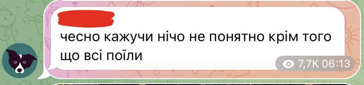 Громадська діячка, голова комунікацій медіа "Ґрунт" Меланія Подоляк за результатами зустрічі опублікувала короткий вислів: "Чесно кажучи нічого не понятно, крім того, що всі поїли".